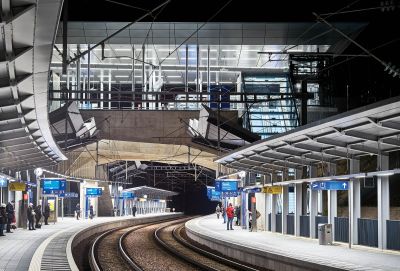 Tekst: After seven years of refurbishment and conversion work, the finishing touch was finally added to Oostende station: a roof. The project included the redevelopment of the tram station and parking areas, the restoration of the historic station building, the construction of a series of new platforms, and the replacement of the ageing railway platform canopies by a roof covering railway, tram and bus platforms as well as the underground bicycle storage facilities. The architects sought to recapture the original grandeur of the platform roofing by designing an 11m high translucent platform roof in colours reminiscent of the sea – blue, green, yellow and white. The interplay of light and colour filtering through this creates a warm and pleasant atmosphere. The columns of the steel structure consist of four tubes that flare out at the top. On top of the 3D-lasered tubular columns, double I-beams run in both directions.