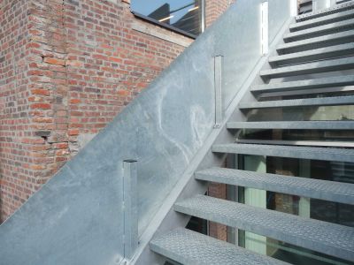 Tekst: L’escalier avec palier supérieur a été entièrement réalisé à partir d’éléments structurels en acier. Les deux limons sont composés de gaines en acier soudées (320/80/10 mm). Entre les deux limons, des gaines en acier (80/40/5) ont été soudées, sur lesquelles des tôles pliées d’une épaisseur de 5 mm ont été prévues. Les gaines et les tôles ont été soudées sur place contre les limons. Le palier supérieur est constitué de cassettes pliées d’une épaisseur de 5 mm.