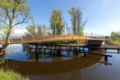 Tekst: Ce pont cyclable asymétrique avec caisson de torsion porteur et tablier en porte-à-faux attire discrètement le regard dans le paysage de polders entre Voorhout et Noordwijk auprès de Leiden (Hollande du Sud). Le pont décrit une courbe prononcée, encadrée à l'intérieur par le caisson de torsion qui s'élève au-dessus du tablier. Les points d'appui intermédiaires sont situés directement sous le caisson de torsion, à l'endroit où les efforts sont les plus importants. La conception structurelle réduit au minimum la différence de hauteur pour les cyclistes, ce qui contribue au confort d'utilisation. Les deux approches diffèrent à presque tous les égards : un remblai d'un côté et une construction dans l'eau de l'autre. C'est là que commence le pont avec une partie plate, qui offre aux cyclistes qui montent de l'espace pour prendre leur élan et à ceux qui descendent de l'espace pour surveiller la route transversale et s'arrêter si nécessaire. En raison de sa forme et de ses dimensions (73 m de long, 4 m de large), son transport a été un véritable défi. Le pont a finalement été transporté en trois parties jusqu'à son emplacement. Les différentes parties ont ensuite été assemblées à l'aide de boulons. Une attention particulière a été accordée à la conception minutieuse des trappes qui rendent les raccords accessibles tout en les dissimulant à la vue.
