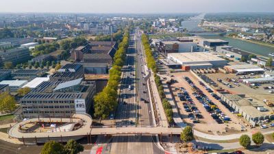 Tekst: Après deux ans d'études, un pont sur le Grote Ring (R71) à Hasselt s'est avéré être la solution la plus sûre pour les nombreux cyclistes et piétons qui empruntent le carrefour très fréquenté de l'Elfde Liniestraat. Le pont élancé pour cyclistes et piétons présente une structure ouverte. Il s'agit d'un pont tubulaire en acier, fabriqué à partir de 1500 tonnes d'acier. Passerelles d'accès comprises, il mesure au total 410 m de long (passerelle d'accès 1, pont autour de la place, passerelle d'accès 2, travée principale et pont en spirale). Le pont dispose d'un tablier orthotrope et est soutenu par des piliers tubulaires en acier. Au-dessus du Grote Ring, la travée mesure 7 m de large, alors que les rampes d'accès mesurent 5 m de large. Les piétons empruntent des escaliers. Le pont serpente entre les vieux platanes et relie les quartiers situés à l'intérieur et à l'extérieur du Grote Ring. Mieux encore, le pont fait efficacement la jonction entre deux futurs bâtiments. Vous trouverez sur le pont des espaces de détente pour pique-niquer, se reposer ou se réunir. En bref, ce pont est bien plus qu'une simple liaison entre A et B pour les environs. C'est un véritable attrape-regard, une porte d'entrée vers les campus et la ville, et un lieu de rencontre. Le 1er octobre 2025, il a été baptisé 'Campusbrug' (pont du campus).