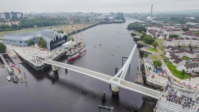 Tekst: Depuis septembre 2024, la passerelle 'Govan Partick Footbridge' à Glasgow relie à nouveau les quartiers de Govan et Partick au-dessus de la Clyde, où un service de ferry était en service jusqu'aux années 60. Long de 115 m, ce pont est l'un des plus grands ponts piétonniers mobiles d'Europe. Il combine une portée suspendue de 95 m avec un pylône (environ 350 tonnes d'acier) et une partie fixe de 20 m. La construction en acier peint auto-patinable (S355J2W) s'harmonise architecturalement avec le Riverside Museum et fait référence aux grues historiques des chantiers navals. VBSC a opté pour une modélisation paramétrique dans Tekla afin de maîtriser la géométrie et la mécanique complexes. Lors de la fabrication, une attention particulière a été accordée à l'alignement précis des ancrages des câbles et aux tolérances. Les cinq segments avec un tablier orthotrope ont été assemblés à Wondelgem pour former un tout et équipés de mécanismes par Demako. Après le montage du pylône et des câbles à Westdorpe près de Terneuzen, avec des poids factices et du ballast, la travée du pont a été transportée par ponton à Glasgow et mise en place en octobre 2023.