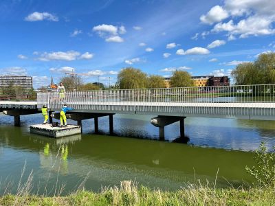 Tekst: Un pont élancé et discret qui fait subtilement référence au 'hoogholtje de Groningue' (pont piétonnier surélevé qui laisse passer les bateaux). Voici le nouveau pont cyclable de 56 m de long qui enjambe la Plataanlaan à Groningue. La municipalité souhaitait un pont plat qui ressemble à la planche archétypale au-dessus de l'eau. Pour que cela soit possible, tout en conservant un passage libre sans point d'appui sur la route provinciale en contrebas, le choix s'est porté sur une construction dite 'à béquilles'. Les points d'appui sont inclinés et forment un ensemble triangulaire avec les culées. Grâce à l'effet de voûte des points d'appui inclinés, le tablier est élancé malgré la grande portée. Toutes les parties du pont sont reliées entre elles de manière particulièrement solide : les concepteurs ont opté pour un pont en acier et béton, dans lequel l'acier et le béton fonctionnent ensemble d'une manière extrêmement efficace. Un caisson en acier constitue la structure porteuse principale, sur laquelle repose un tablier en béton. Ce dernier est relié au caisson en acier à l'aide de goujons. Le pont en acier et béton combine ainsi le meilleur des deux mondes : un pont élancé et rapide à construire à un prix attractif. La balustrade à bandes est sobre et transparente, de sorte que la ligne horizontale continue du pont est particulièrement mise en valeur. La balustrade est toutefois également très raffinée, notamment grâce à sa conception multicouche. Elle se compose de deux bandes différentes.