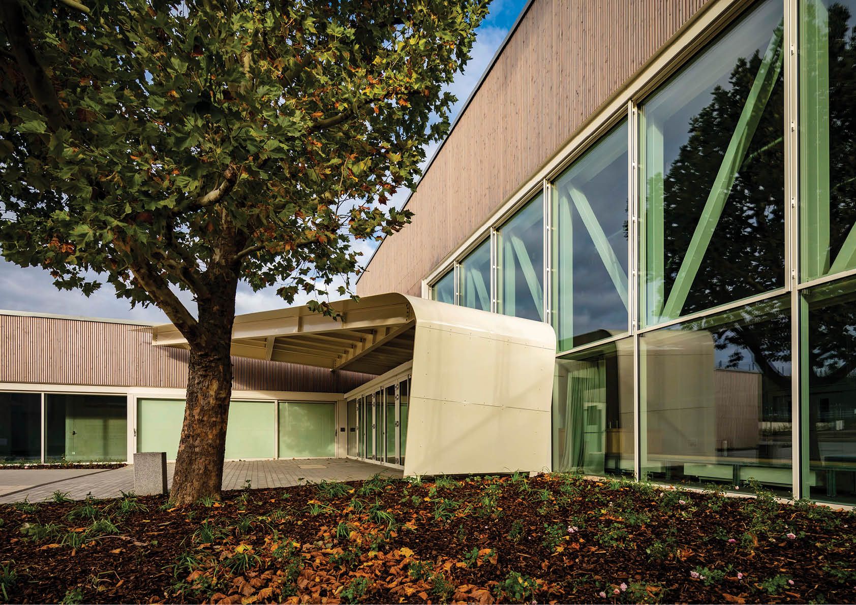 Implanté dans la zone Nord du site du Parc des Sports, le volume simple et compact est constitué en partie de voiles de béton et en partie de voiles en bois massif et poutres bois en lamellé-collé (salle principale), ainsi qu’en structure acier : auvent, poutre treillis de contreventement du mur rideau, locaux aération. Les façades sont composées d’une façade ventilée de bardage Douglas et châssis en profilé alu à coupure thermique et triple vitrage. Les éléments en acier de la façade principale sont composés de manière à mettre en scène les contraintes qui agissent dans la matière. L’auvent en ossature acier est en partie suspendu à un câble. La poutre treillis est dessinée pour optimiser la reprise des charges et limiter la flèche de l’élément. A l’intérieur, l’emploi des matériaux rappelle celui des bâtiments industriels. Béton et techniques sont apparents tandis que les finitions font généreusement appel à l’acier : panneaux acoustiques, bancs, garde-corps, mains courantes, etc.