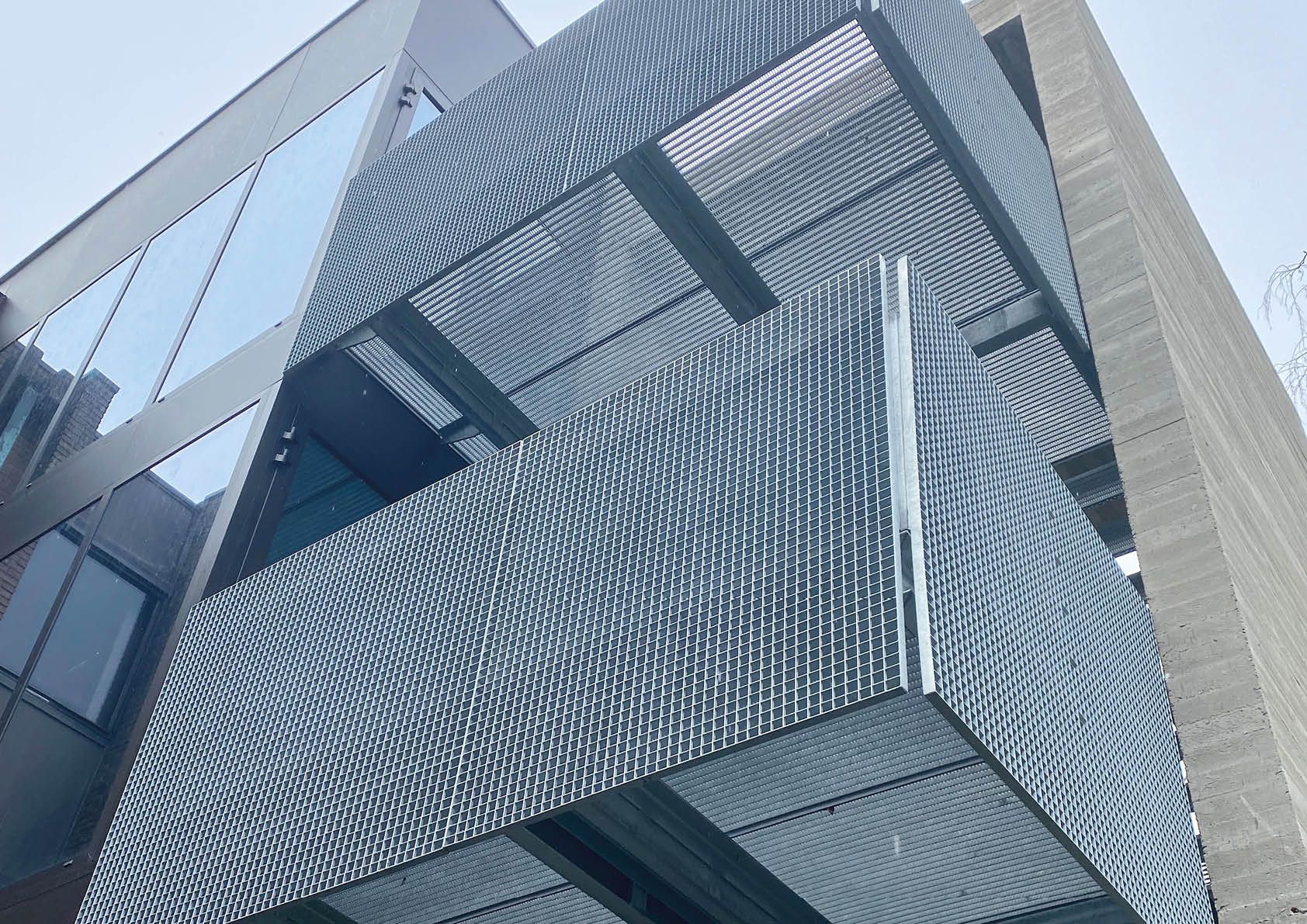 Ainsi, une nouvelle rampe en acier galvanisé a été conçue à l’entrée en plus d’un volume d’ascenseur dans les limites du bâtiment actuel. Un volume d’escalier de secours ouvert en béton apparent exposé et en acier galvanisé a été prévu à l’arrière du bâtiment. On retrouve également ce matériau dans la structure de suspension de la passerelle et dans les escaliers, les marches et garde-corps, dont les lames de planchers sont complétées par une grille à mailles fines.