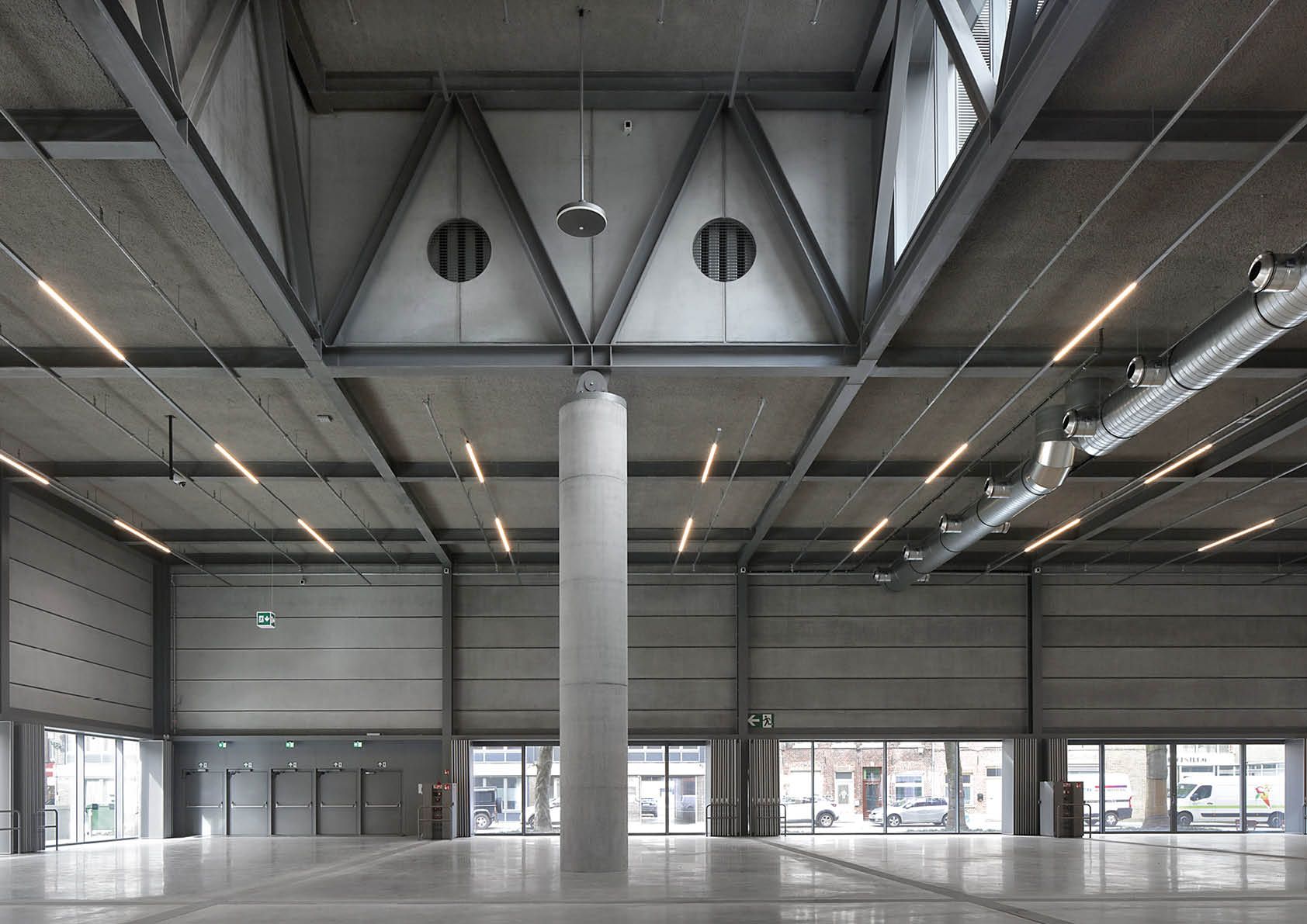 Le hall d’exposition de 4480 m2 repose sur un piédestal en verre, attirant la place extérieure à l’intérieur comme une place couverte. Il s’agit d’un espace élevé dont les dimensions des baies sont de 15/30/15 m et qui repose à l’intérieur sur seulement six colonnes circulaires en béton de 1,20 m d’épaisseur. Six fermes secondaires et deux fermes primaires en acier transfèrent les charges des fermes secondaires aux six colonnes via une imposition architecturale articulée. L’entrée de la salle de conférence est dominée par un impressionnant porte-à-faux de 60x6 m qui assure une transition progressive entre le parvis et l’entrée.