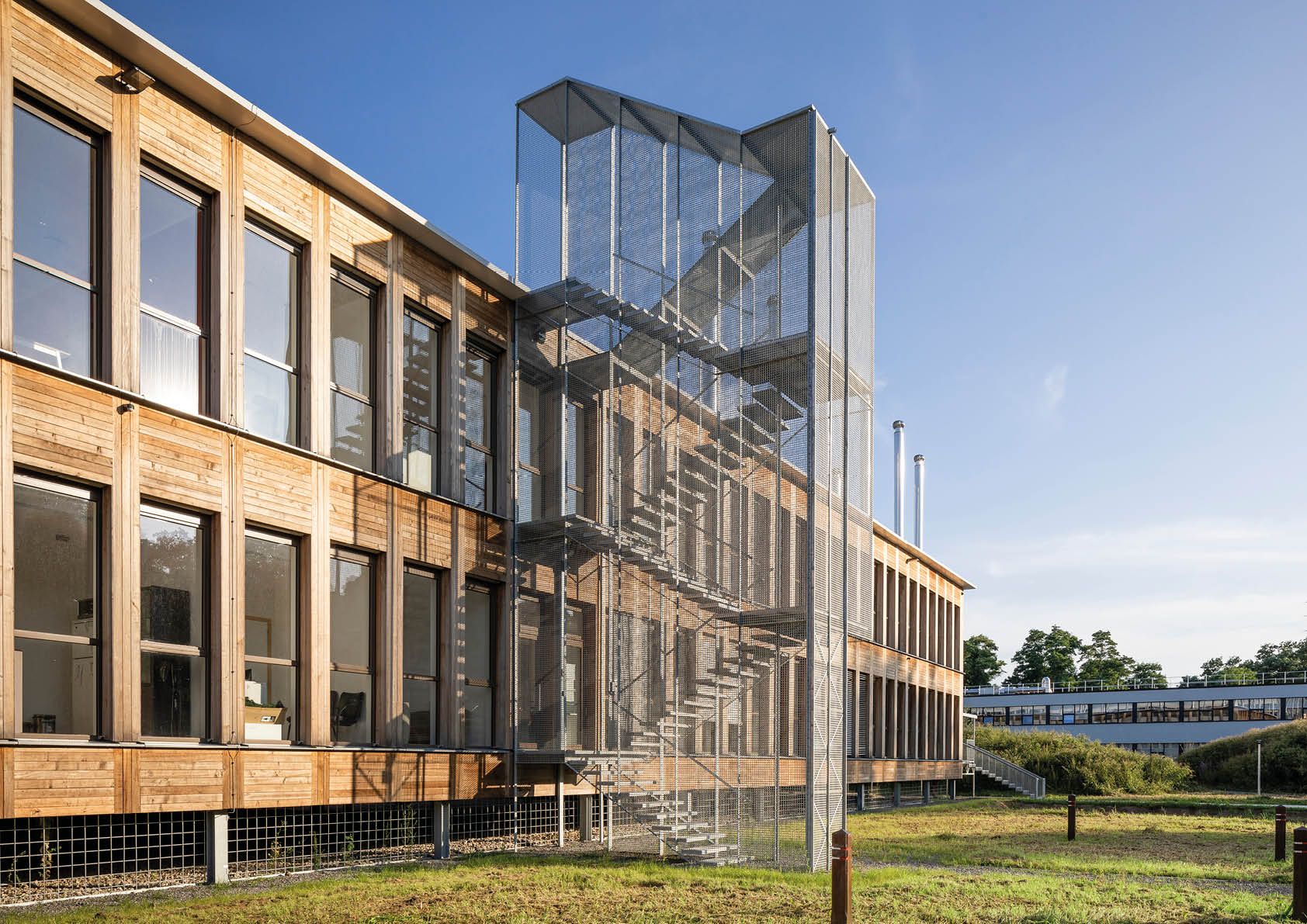 L’acier se retrouve également dans plusieurs éléments greffés au bâtiment, notamment la large coursive en panneaux de tôle larmée et l’auvent vitré qui la couvre tout le long de la façade principale. On peut également pointer l’ascenseur et la passerelle extérieurs, constitués de sous-ensembles soudés faits de profilés laminés (L, T et HEA) et galvanisés à chaud par trempage. La tour et l’escalier de secours sont habillés par des panneaux en tôle perforée Magnelis® qui contribuent à une grande transparence.