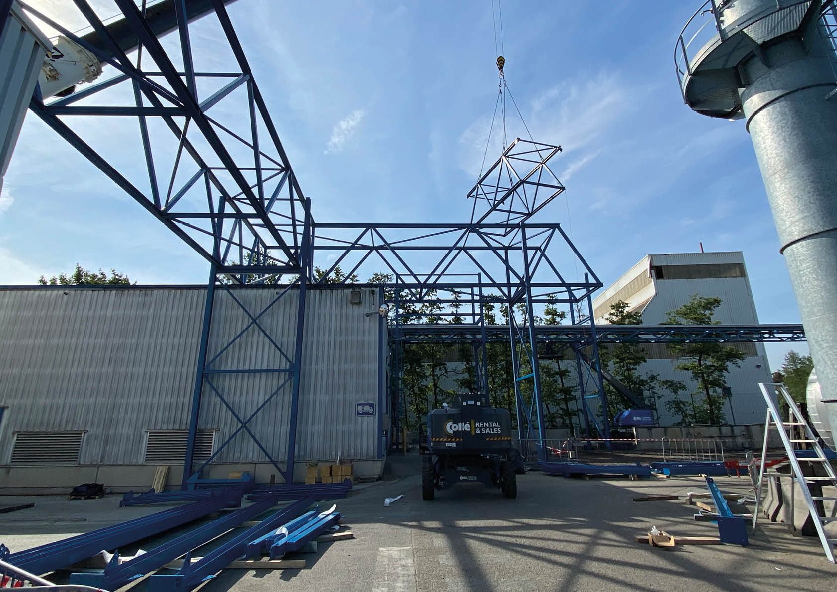 La première section se trouve au-dessus d’un bâtiment sur lequel on trouve un grand nombre de tuyaux, de plateformes, d’escaliers et d’échelles. La deuxième section passe au-dessus d’une passerelle de conduites existante et complètement indépendante de la nouvelle structure. L’exécution finale en treillis comprend 43,5 tonnes d’acier S235JR. L’ensemble a été métallisé et recouvert de deux couches de peinture RAL 5019. Les colonnes et les passerelles ont été préassemblées au sol, puis hissées en place à l’aide d’une grue lourde (140 tonnes).