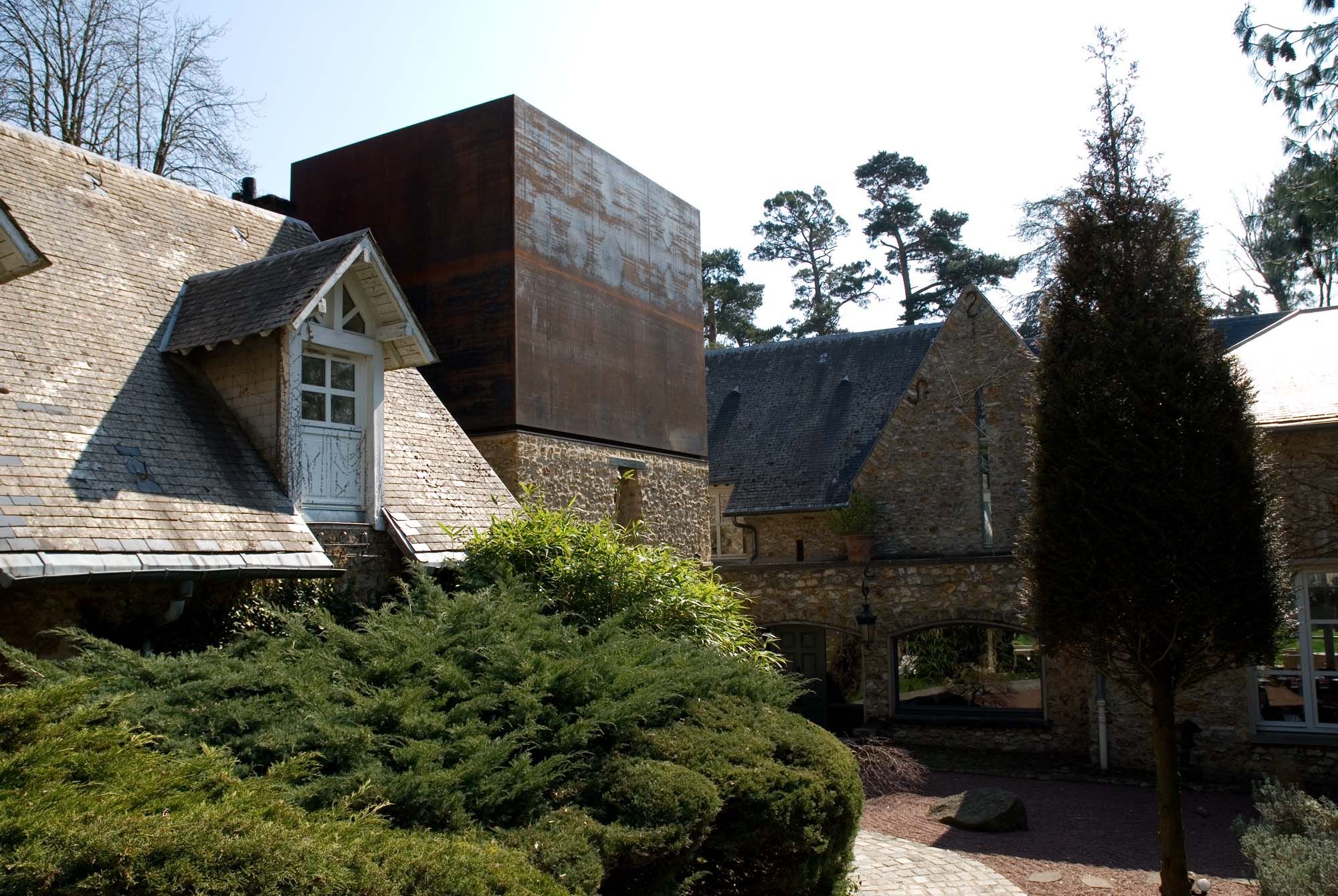 Une forme, une masse ..une tour, un donjon!.. ce projet se devait de conserver la force du concept initial et ne souffrir d’aucun artifice architectonique, ni d’empilement démonstratif technique. C’est la raison pour laquelle l’architecte a opté pour une utilisation radicale d’acier autopatinable. Ce sujet était l’occasion d’expérimenter une autre conception de l’acte de construire : une coque étanche en acier auto-patinable structurant, fabriquée en atelier pour se substituer à la toiture de la chapelle. Le cube d’environ 6 m d’arrête vient ainsi doubler le volume existant en hauteur dégageant trois niveaux. Laminé à chaud, l’acier noir se transforme lentement chaque jour, prenant sa teinte rouille en accord avec la pierre meulière dont est constitué le socle. Ce bloc est-il plein ou vide? L’architecture ne laisse rien transparaître de sa technicité, de son programme, en fuyant tout maniérisme ... et cela grâce à l’acier !