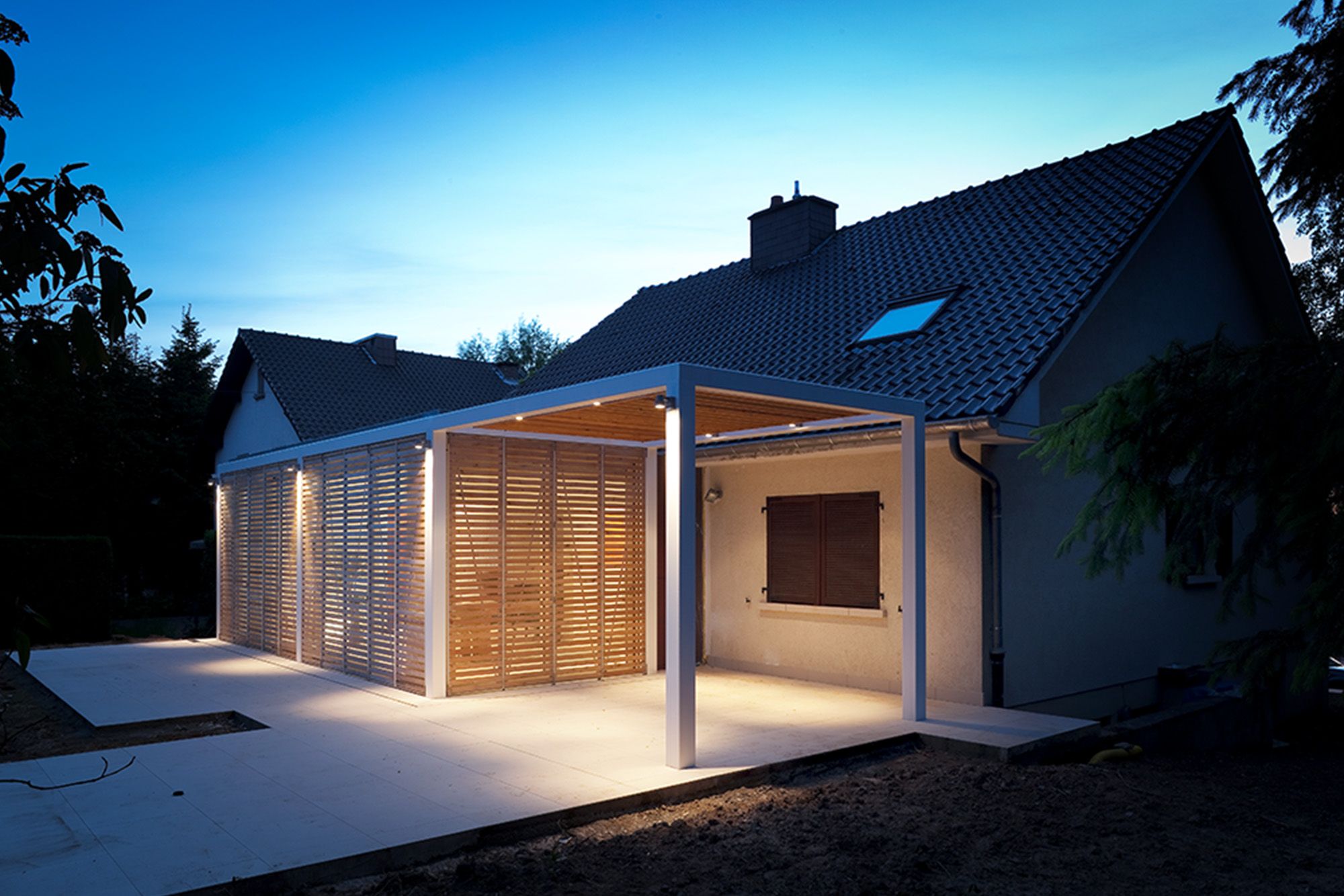 Largement ouverte vers le grand jardin, elle assure la continuité spatiale intérieur-extérieur. Elle se compose d’une grande terrasse sur laquelle est déposée une structure métallique. Sa configuration tripartite - volume vitré et pergola - exprime l’organisation interne de la maison.