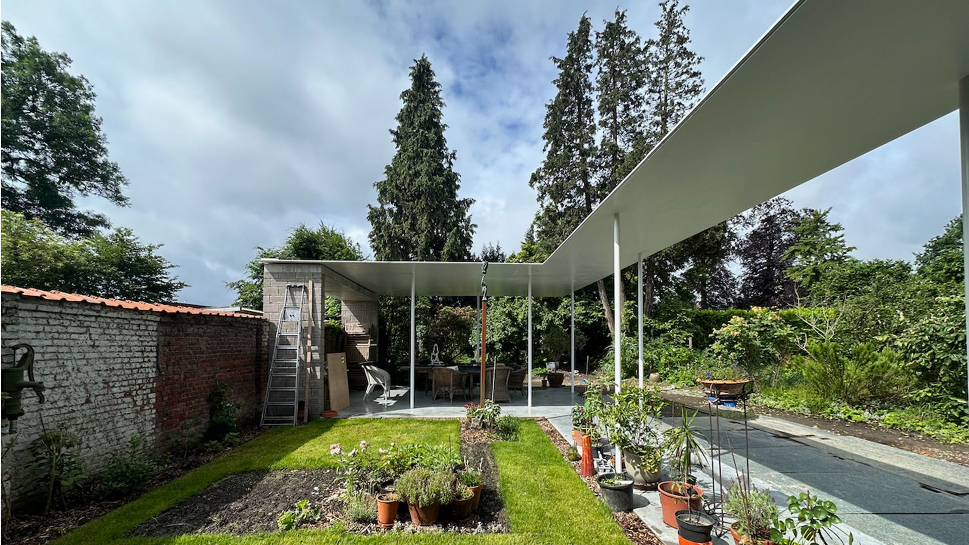 Un auvent est prévu contre la maison, qui aura la même empreinte que la Koetshuis (remise) : un jardin est prévu au centre de cet auvent froufroutant. L'auvent est donc une extension de l'espace de vie avec un espace de vie extérieur. Comme une feuille de papier, l'auvent élancé, blanc et en acier, forme une séparation subtile entre les différents jardins et contraste aussi magnifiquement avec les volumes en briques de la résidence du maire. La tôle d'acier de 15 mm a été soudée sur place à 9 colonnes d'acier de seulement 60 mm de large. Dans cette conception, l'utilisation de l'acier a permis de créer un élément élancé et contrasté qui est complètement séparé et complémentaire du volume patrimonial dans son caractère.