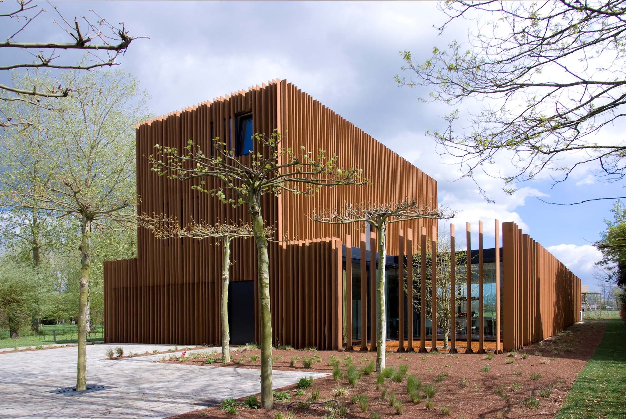 Pour souligner la verticalité de la maison, des lamelles verticales ont été choisies comme revêtement de façade. Les lamelles et les panneaux perforés sont en acier autopatinable.