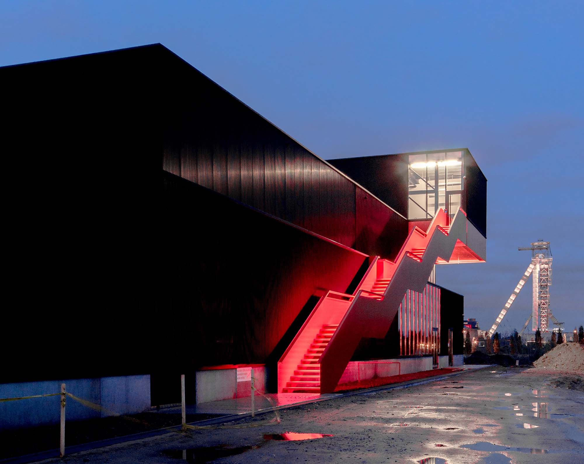 Le constructeur de décors pour la télévision et de stands Deusjevoo s’est installé récemment le site de C-mine-site à Genk. Le bâtiment industriel atypique a comme point de mire le long escalier rouge de 24 m qui mène vers l’entrée.