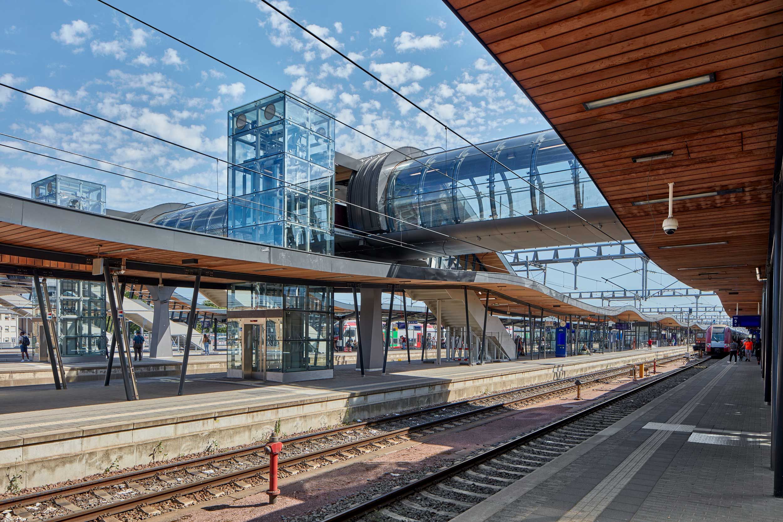 Eind vorig jaar werd een gloednieuwe passerelle in gebruik genomen in het station van Luxemburg Stad, ter vervanging van een tijdelijke structuur. Deze beglaasde staalconstructie, die is uitgevoerd in het kader van de uitbreiding en modernisering van het station, biedt alle gebruikers voortaan een drempelvrije toegang. Voetgangers, fietsers en personen met beperkte mobiliteit kunnen zo vlot de Bonnevoie-wijk bereiken vanuit de stationsbuurt, over de zes perrons en tien sporen heen.
