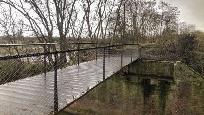 De loopbrug werd met een rupskraan over een afstand van ongeveer 500 m over de plaatselijke weg naar de locatie getransporteerd. Bij het ontwerp en de afmetingen van de constructie moest rekening worden gehouden met de capaciteit van de kraan en de beschikbare ruimte op deze weg vanwege de bomen.</p>