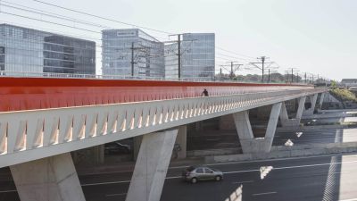 Deze belangrijke nieuwe fietsbrug is de eerste fietsbrug over de ring rond Brussel (R0). De 6 stukken werden in 3 keer over de Ring rond Brussel aangelegd.</p>