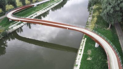 Tekst: <p>De Jacques Roggebrug in Deinze maakt deel uit van een verhoogd fietstraject (F7) van ca. 600 m, inclusief twee kleinere fietsbruggen.</p>