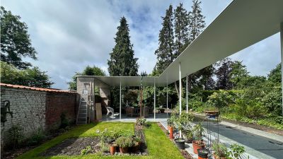 <p>Tegen de woning is een luifel voorzien die dezelfde footprint als het Koetshuis krijgt: centraal in deze frèle luifel is een tuin voorzien. De luifel is dus een verlenging van de leefruimte met buitenleefruimte. De slanke, stalen, witte luifel vormt als een blad papier een subtiele scheiding tussen de verschillende tuinen en staat bovendien mooi in contrast met de bakstenen volumes van de burgemeesterwoning. Het stalen blad van 15 mm is ter plaatse gelast op 9 stalen kolommen van slechts 60 mm breed. Het gebruik van staal heeft bij dit ontwerp geleidt tot een slank en contrasterend element dat in zijn karakter volledig los en complementair staat van het erfgoed volume.</p>