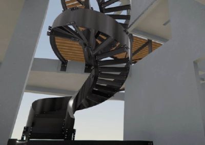 <p>De trap steunt op een zware betonnen ligger die vrijgemaakt en nauwkeurig opgemeten werd. Vervolgens werd het 3D-model gebruikt om de torsing van de trap te kunnen vertalen naar uitvoerbare tekeningen, uitslagen van platen en het monteren van de constructie. </p>