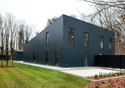 <p>De keuze voor een staalstructuur lag dus voor de hand, ook om de uitvoeringsfase zo kort mogelijk te houden – het volledige bouwproces, van afbraak tot en met interieurafwerking, nam slechts negen maanden in beslag! – en vanwege economische en ecologische redenen (recyclage). Zowel de wanden als het dak zijn integraal bekleed met antracietgrijze industriële sandwichpanelen. De onderkant van de dakoversteken boven de beglaasde kopgevel, die oververhitting vermijden, en de wanden die aansluiten op de terrassen zijn dan weer afgewerkt met hout. Dit zorgt voor een fraai visueel contrast. </p>