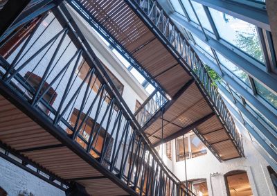 <p>Staal is de rode draad in bijna alle architecturale ingrepen, van de verhoogde gevel aan de straatkant tot de nieuwe achtergevel, de glazen koepel en een fantastische circulatievoorziening met trappen en passerelles die leven en werk in het neoklassieke gebouw opnieuw definiëren.</p>