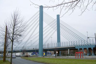 Tekst: <p>De stadsbrug De Oversteek verbindt Nijmegen-West met de stadsuitbreiding op de noordoever van de Waal.</p><p>De brug bestaat uit vier rijbanen en een pechstrook. Aan de stadskant is een pad van 4 m breed voor fietsers en voetgangers gecreëerd. De totale lengte van de brug is 1.195 m, inclusief aanbruggen. De stalen brugconstructie is met een hoofdoverspanning van 285 m de grootste enkelvoudige boogbrug in Europa. Deze hoofdoverspanning overspant niet alleen de vaargeul, maar de hele rivier.</p><p>De boogconstructie sluit aan op de vormgeving van de oude Waalbrug. Het traditionele metselwerk met bakstenen aan de zijkanten van de aanbruggen verwijst naar Nijmegen als stad en geeft de brug een stedelijk karakter.</p><p>Door gebruik te maken van de krachtswerking van de boog is de brug met een minimum aan staal uitgevoerd. Vanwege deze slankheid van de brug, de beeldkwaliteit en de eisen voor de brandveiligheid is geopteerd voor hoogwaardig staal.</p>