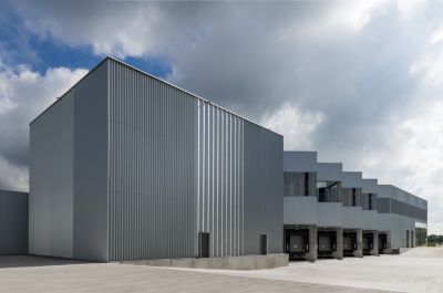 • Tekst: In dit project werd geen standaard stalen gevel toegepast, maar werd beslist om de gevel te verbijzonderen. Samen met producent ArcelorMittal werd een gevel op maat ontworpen. De gevel bestaat uit een combinatie van 3 verschillende geplooide stalen gevelprofielen met een aluzinc-coating. Door de puntprofielen in verschillende hoeken te voorzien, ontstaat een spel van licht en hoewel het gebouw dezelfde kleur heeft, wordt toch een gevarieerd gevelbeeld verkregen.