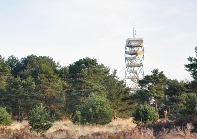 • Tekst: <p>Sinds april 2022 heeft de Kalmthoutse heide een nieuwe brandtoren. De slanke constructie ziet op haar hoogste punt 42 m boven het natuurgebied uit en combineert brandcontrole met communicatie en recreatie. </p><p>De toren is samengesteld uit drie stalen vakwerken die zijn opgebouwd uit driehoeken van 6 m hoog. Door deze segmenten op een regelmatige manier ten opzichte van elkaar te verdraaien ontstaat een dynamisch effect waardoor het silhouet van de toren vanuit elke hoek een ander beeld laat zien.</p><p>Om het totaal volume aan staal binnen de perken te houden werd de constructie stijver en dus stabieler gemaakt door vier poten aan de basis toe te voegen. Voor de staalstructuur werd bijzondere aandacht besteed aan de staalknopen waar telkens 6 geboute kokers en walsprofielen in één punt moeten uitkomen. Ter hoogte van elk knooppunt worden de kokers onzichtbaar aan de knoop verankerd. </p>