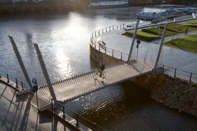 Tekst: <p>In het kader van de bouw van een nieuwe sluis voor grote schepen ter hoogte van de stuw van Ivoz-Ramet (Maas) bleek al gauw de noodzaak een verkeersbrug aan te leggen naar het eilandje tussen de oude en de nieuwe sluis (centrale pier). Omwille van zijn geringe visuele impact drong zich na analyse de keuze op van een beweegbare brug. Alle oplossingen met vaste bruggen impliceerden lange toeritten die rekening moesten houden met het drukke scheepvaartverkeer.</p><p>Het weerhouden kunstwerk is 33 m lang en heeft een nuttige breedte van 7 m. De draagstructuur is een stalen raamwerk van 80 ton, aangevuld met een betonnen tegengewicht van 40 m3. In dwarsprofiel bestaat de brug uit een centraal berijdbaar gedeelte, waarin de opleggings- en rotatiemechanismen van het kunstwerk zijn gehuisvest en 2 laterale stalen kokers waarin het vergrendelingssysteem verwerkt zit.</p><p>De gekozen kinematica is een rotatie in horizontaal vlak (ongeveer 70°), aangevuld met een lichte kipbeweging van voor naar achter aan het einde van de rotatie (1%), om de brug in haar finale positie te vergrendelen.</p>
