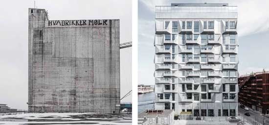 In havengebied Nordhavn in Kopenhagen werd een vijftig jaar oude graansilo (foto: The Silo - Rasmus Hjortshøj) omgevormd tot appartementencomplex. Hiervoor werd de betonnen mastodont 'gedrappeerd met een nieuwe overjas' van gegalvaniseerd staal. Naast de 38 appartementen zijn twee publiek toegankelijke functies toegevoegd; een ruimte voor evenementen en tentoonstellingen op het gelijkvloers en bovenaan een glazen verdieping met restaurant. Maria Aufegger van COBE Architecten komt uitleg geven bij dit en andere van hun projecten.