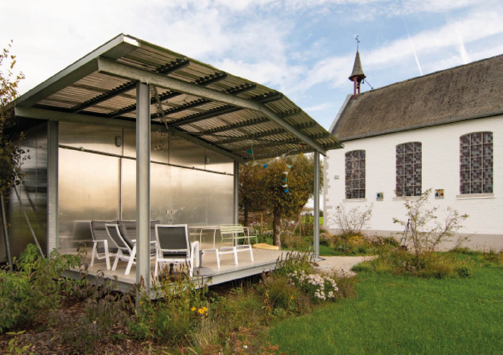 L'abri de jardin, qui repose sur une charpente métallique flottante, est construit en profilés d'acier laminés et formés à froid. La toiture et la façade sont recouvertes de tôles d'aluminium ondulé et de bardages.