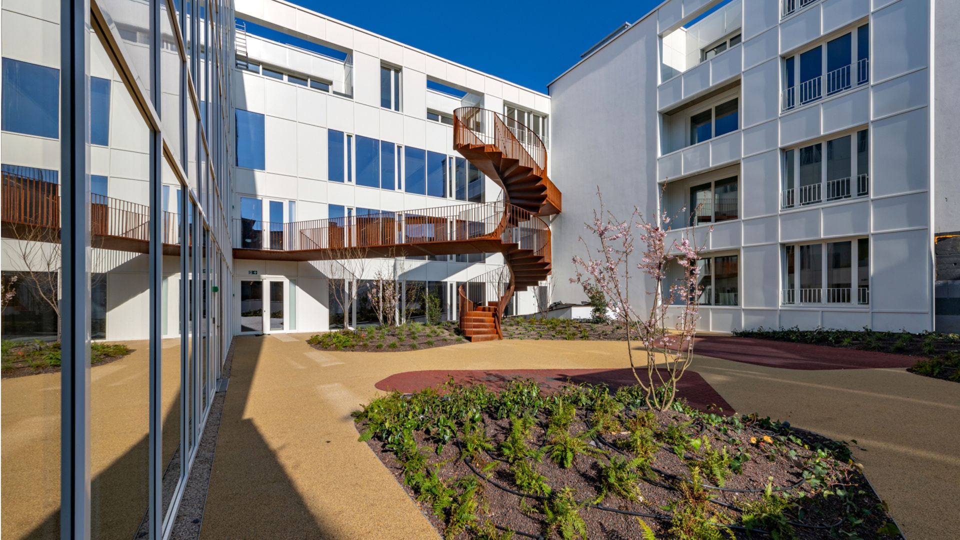 Le projet de réhabilitation lourde (démolition, reconstruction complète tout en conservant les façades) d’un îlot situé rue Madeleine à Liège comprend la création d’un patio végétalisé couvrant un parking. Ce lieu central du projet nécessite la création de connexions verticales. Un escalier hélicoïdal en acier auto-patinable ('corten') dessert 2 passerelles de connections distribuant les étages supérieurs.