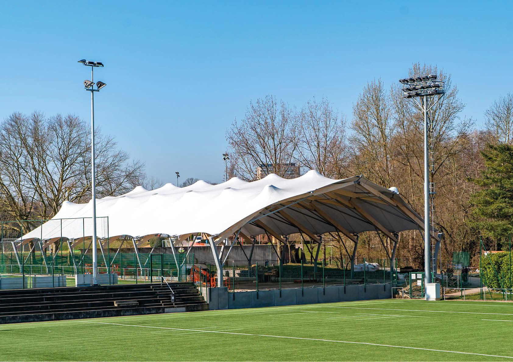 In het sportcentrum van Neder-Over-Heembeek zijn drie sportvelden overkapt met één textielzeil van meer dan 1400 m². Dit laatste is bevestigd op en gespannen over een slanke draagstructuur, bestaande uit gemengde portieken in staal en gelijmde gelamineerde houten balken die als bogen fungeren. Het bovenste stuk van deze portieken, waarop de dragende delen van het zeil ‘steunen’, bestaat uit Y-vormige liggers in gelijmd gelamineerd hout.