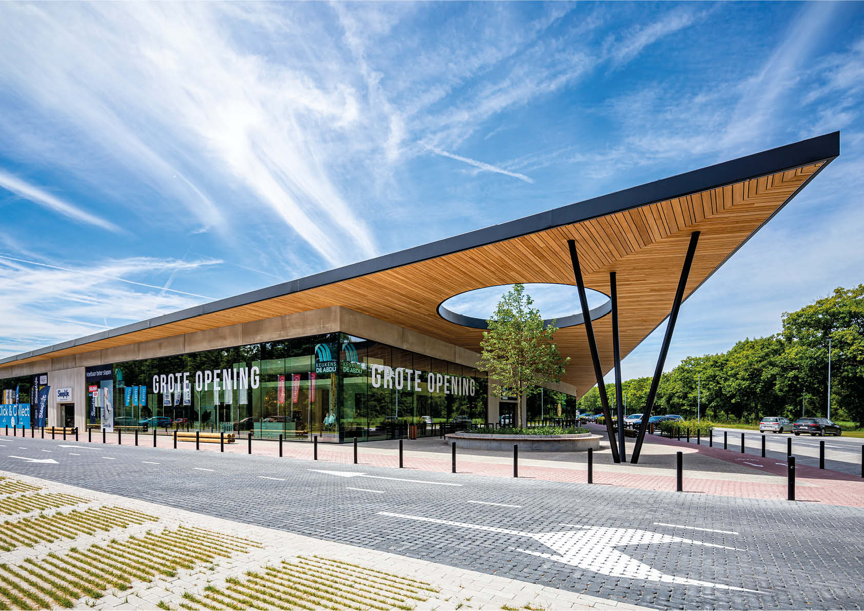 De voormalige site van een meubelbedrijf in Zoersel werd omgetoverd tot een retailpark met acht winkels. Om het evenwicht tussen bebouwde en natuurlijke omgeving te behouden, werd gekozen voor een eyecatcher in de vorm van een indrukwekkende stalen luifel van 17 meter. In de luifel is een cirkelvormige opening voorzien waarin een boom van acht meter groeit.