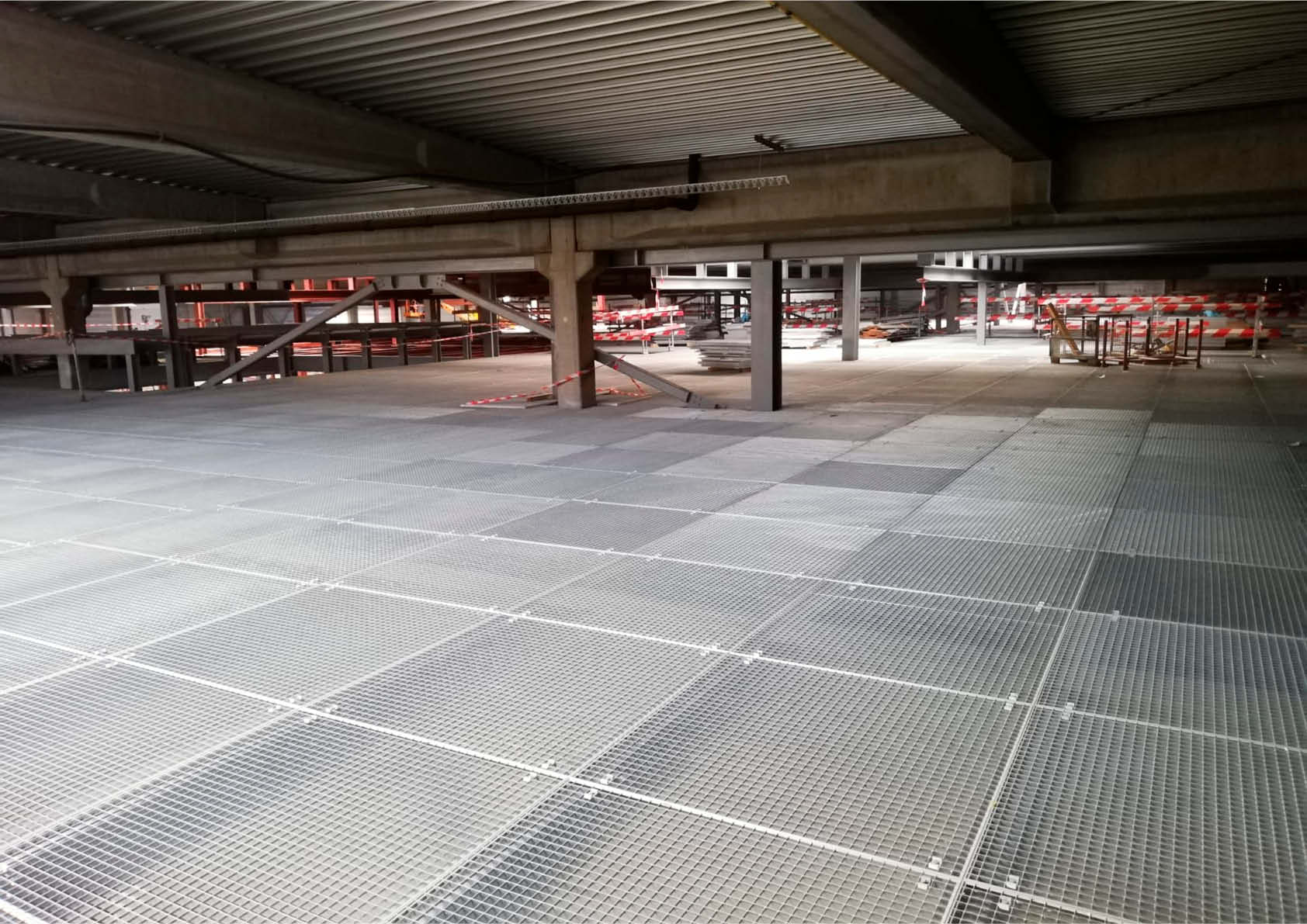 Alvorens de werken aan te vatten, werd een volledig nieuwe onafhankelijke fundering voorzien, uitgevoerd door middel van gevulde stalen voerbuizen. Gezien de constructie binnen het bestaande gebouw moesten de lengte en het maximale gewicht van de stalen liggers beperkt blijven. In totaal werd maar liefst 565 ton staal voorzien voor de verdiepingsvloeren, inclusief een volledige brandwerende behandeling (meer dan 10.500 m² brandwerend schilderwerk). Op de staalconstructie zijn 2700 m² roostervloer en 1.250 m² zwaluwstaartvloeren (Cofrastra) geplaatst.