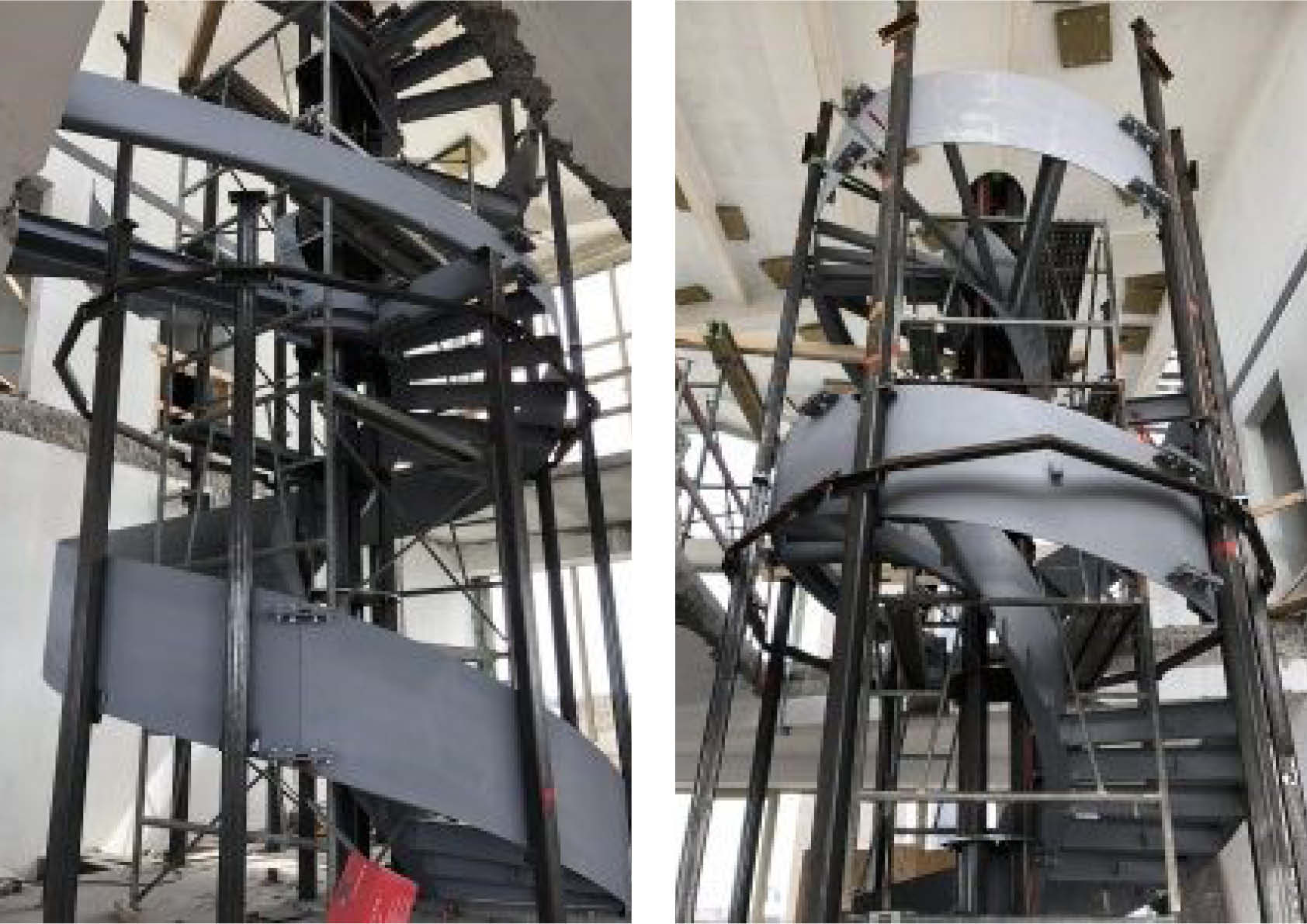De wenteltrap weegt in totaal slechts 4,2 ton, maar werden in verschillende bouwdelen opgedeeld. Deze stukken werden namelijk tot bovenaan het penthouse gehesen en via een nauwe opening naar binnen gebracht op het dak van het gebouw. Daarna werden de verschillende bouwdelen ter plaatse aan elkaar gelast. Door middel van montagekoppelingen werden de onderlinge relaties tussen de verschillende bouwdelen behouden.